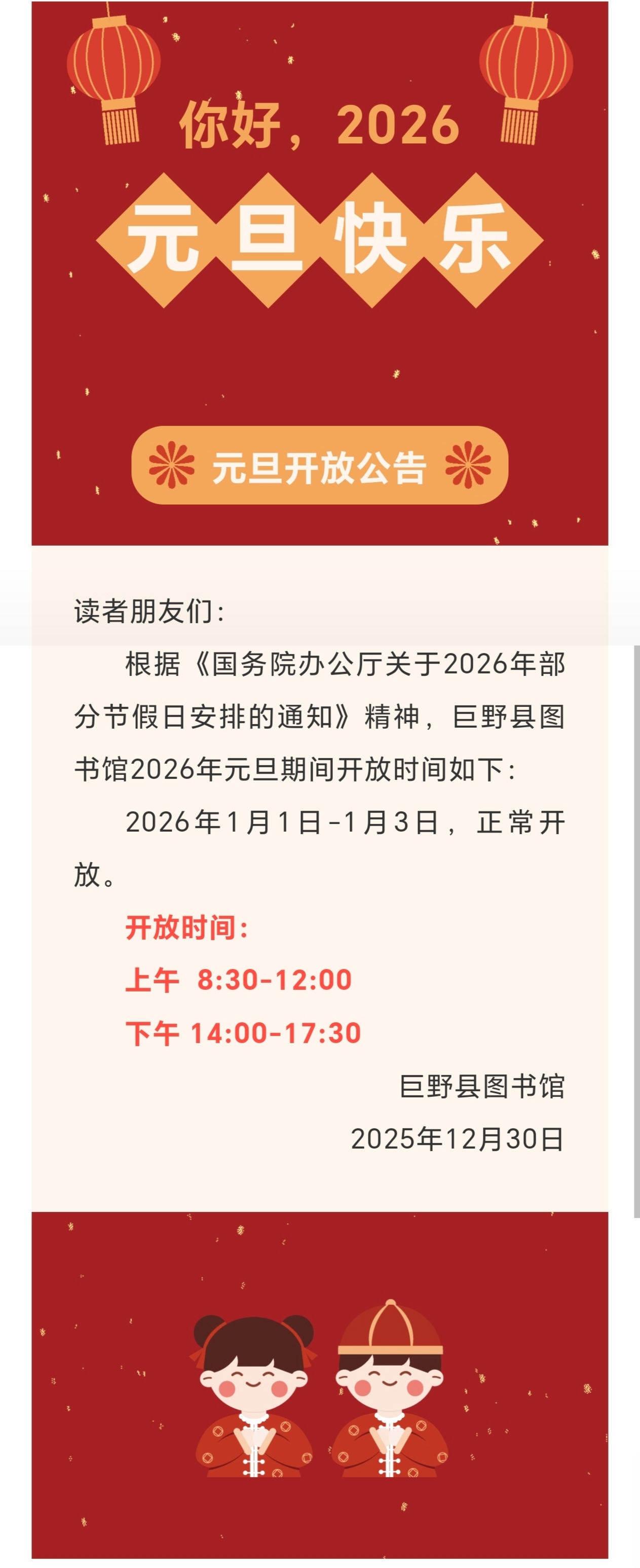 巨野县图书馆2026年元旦假期开放时间公告