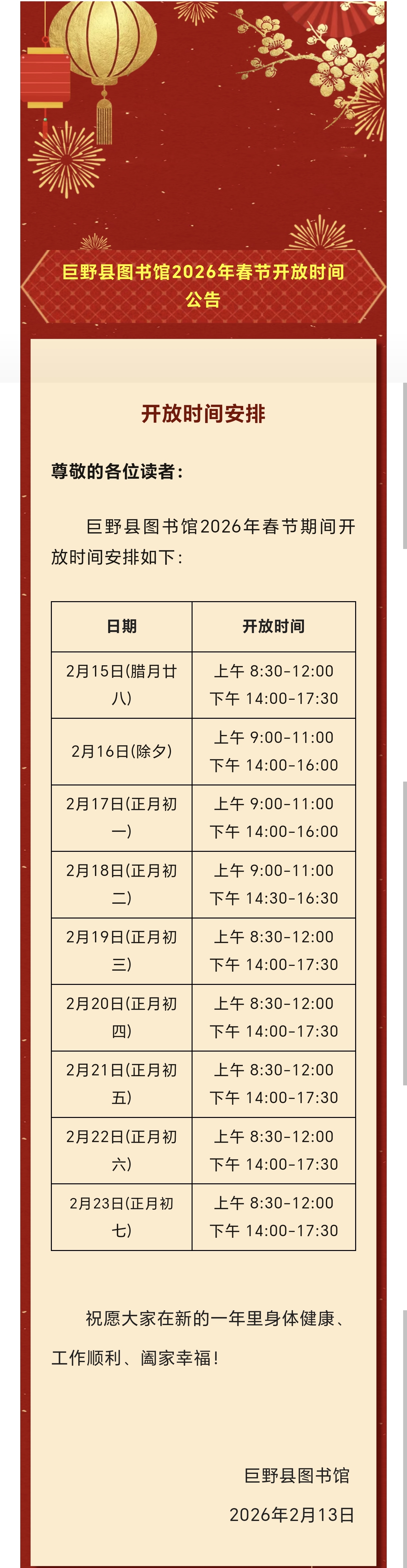 巨野县图书馆2026年春节开放时间公告